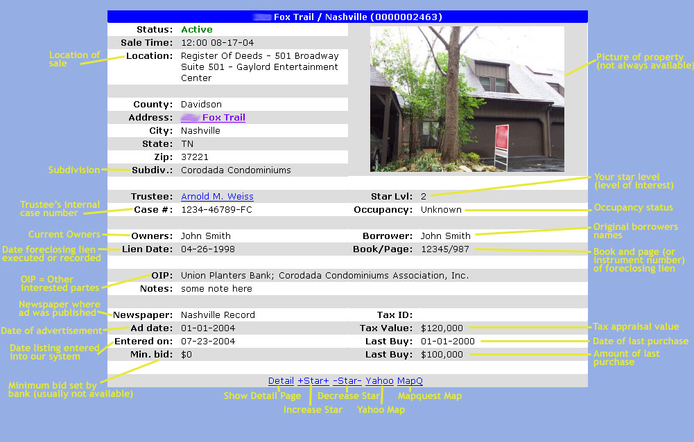 The first three items (Detail Level, Sort By, and County) work exactly the same as they work in the Quick List. Please see above. Status Select the status of properties you're interested in. Perhaps you only want to see properties that have been sold back to the bank. In that case, you would select REO If you want both REO properties and active sales, click on REO then hold down your CONTROL key while you select Active. Trustee This field allows you to search for properties listed only by a certain trustee. Address, City, Owners, and Notes These fields work similarly. Simply type in the text of what you want to search and the search will include all properties that match your text on that field. For example, to return all properties on "Kentucky Ave", you might just search for "Kentucky". Please note that will also match "Kentucky Street" and "Kentucky Blvd". You can include only a portion of the word to make your search more broad. For example, entering "Nash" in the city field will match "Nashville" and "Nashburg". Entering "John" in the Owners field would match "John Smith" and "Bob Johnson". State Currently we serve only Tennesse. But if we served more states (and we may shortly) you would select them here. Min. Sale Date - Minimum Sale Date If you want to see only searches that are after 8-1-2004, then enter that date in this field and click the Search button. Max. Sale Date - Maximum Sale Date If you want to see only searches that are before 8-1-2004, then enter that date in this field and click the Search button. Min. List Date - Minimum List Date This allows you to see properties that were entered into our system after a certain date. For example, if you knew you had already seen every property entered up to your last login on 8-1-2004, you could enter "8-1-2004" in this box and it would search for properties entered into the system after that date. This effectively gives you an opportunity to search for new listings. Min. Star Level - Minimum Star Level This field allows you to search for propertes that you have marked with a higher star level. If you want to search only for properties that have a Star level of 2 or higher, select "2" and click Search. This allows you to see only properties in which you are interested rather than wading through a list of hundreds of properties.